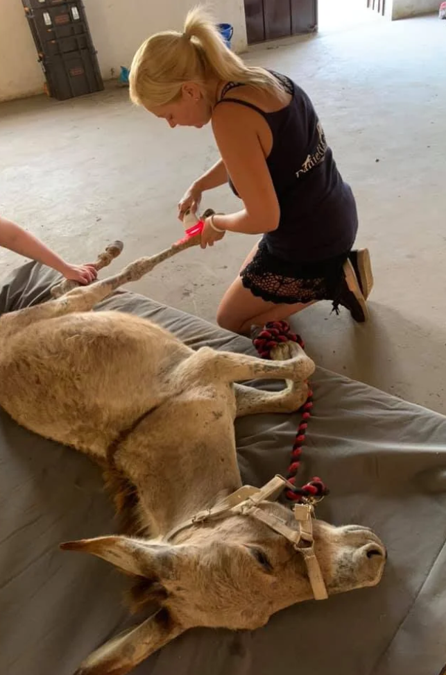 Similarly a donkey named Meredith, who was a new resident, was sedated before Danielle could proceed and offer a full assessment as to why she had such an unusual placement of her limb. Again, Photizo was used prior to soft tissue work being applied, to encourage the normal positioning of the limb.