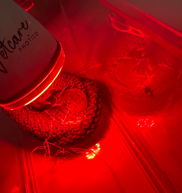 The vole was placed in a plastic container during therapy, allowing for a hands-off approach. The silent Photizo Vetcare device was especially beneficial, as any noise had potential to increase additional stress in the patient.