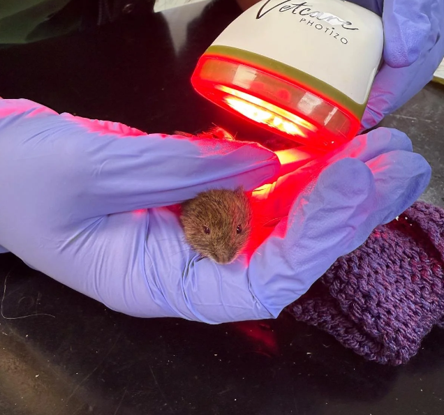 Another patient at Folly Wildlife Rescue, a juvenile vole, came in after being caught by a cat. The vole suffered a large wound on its left hip and reduced mobility in its left leg due to trauma and swelling. The team cleaned the wound with F10 solution and started a course of antibiotics and pain relief. Red light therapy was introduced immediately to aid the healing process.