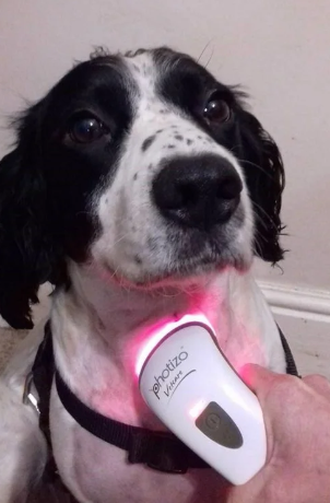 Post-operatively, she came home on day three on pain relief, antibiotics and strict crate rest for a minimum of two weeks. From the day she came home, her owner began to use the Photizo on the surgical site and on both the left and right cervicals from C2 to and around the cranial side of the scapula for added pain relief and healing. The pictures below were from day six post-surgery. The surgical site is almost completely healed, so we’re all hoping that it is the same internally. Jazzy loves having the Photizo on it, so she is obviously getting some instant pain relief from it too.