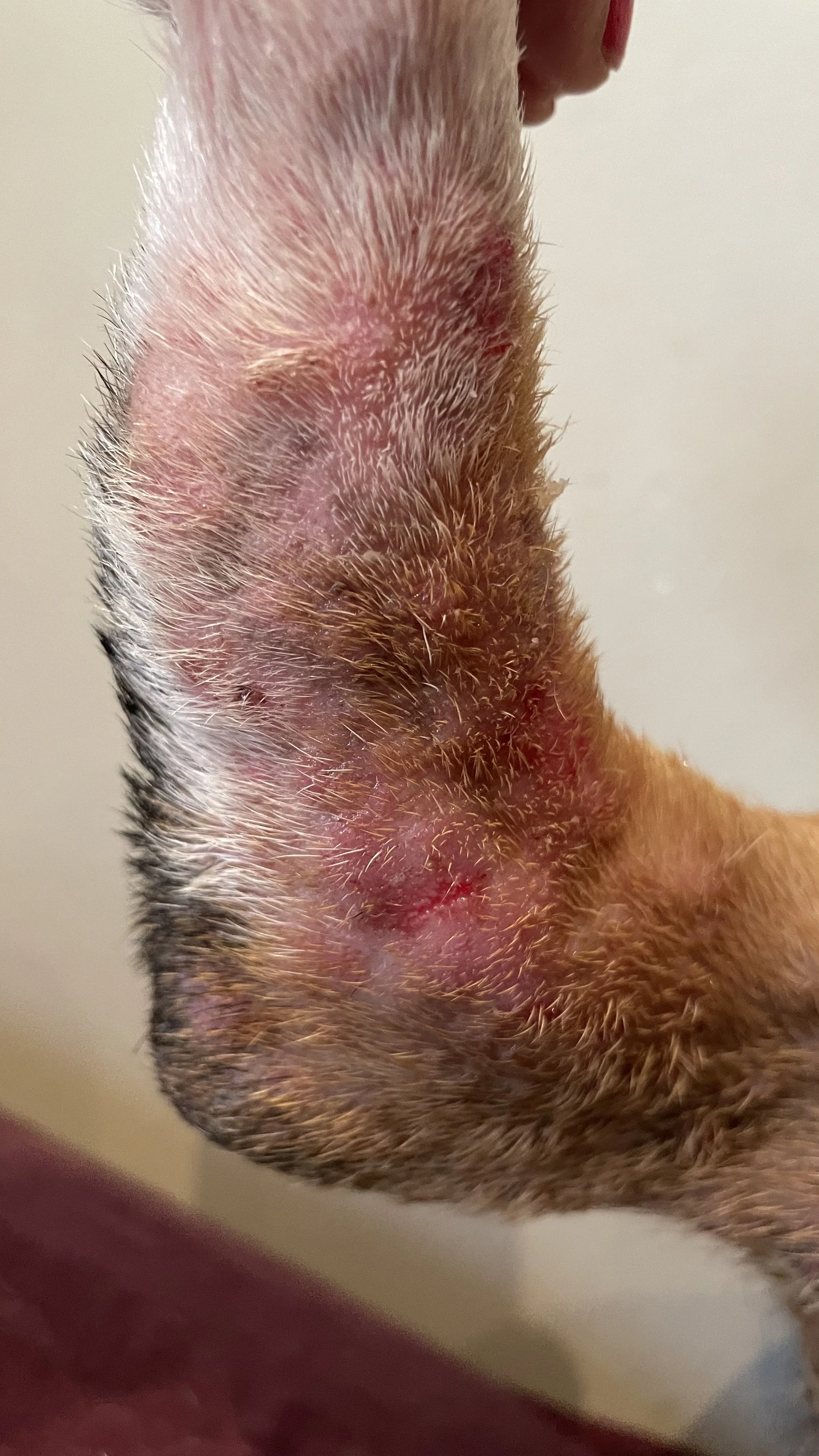 That was, until a walk two days later. "As she went to fetch her ball, her shin bone literally exploded with blood," Anna said. A second, longer course of antibiotics followed, along with continuous bathing, antiseptic sprays, and intensified use of Photizo light therapy.