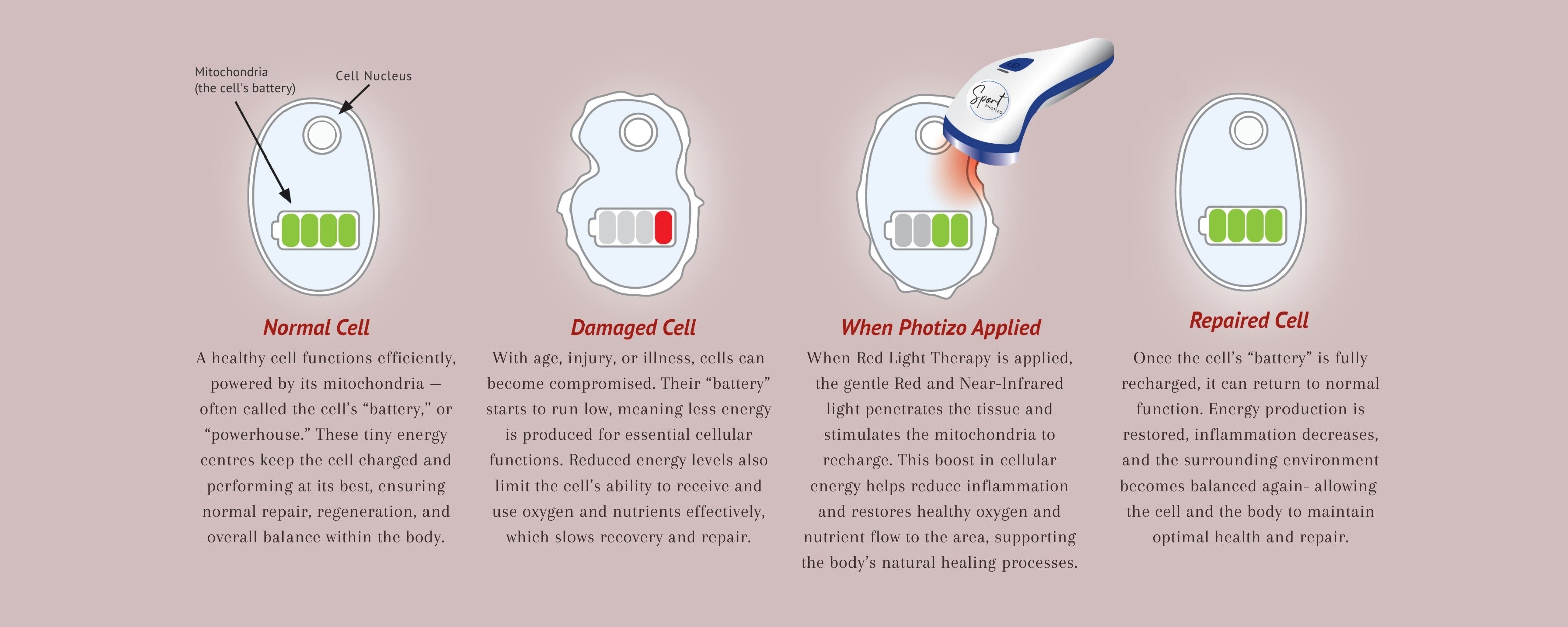 The cell is the building block of the body and if each cell can function at its best, the body will heal itself. This form of light therapy is actually Photobiomodulation or PBM, and utilises the healing power of red and near infrared light. This works by energising damaged cells and increasing your blood flow using highly beneficial wavelengths of LED light.